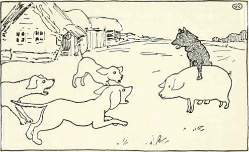 Tam so se vanj takoj zapodili vaÅ¡ki psi; lajali so, renÄali in na vse možne naÄine nadlegovali laÄnega volka.