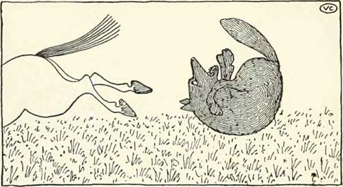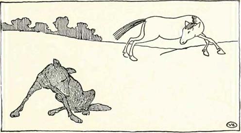 In tako je volk stopil izza konja, da bi zaÄel pri repu, ko se je konj postavil na prednje noge, z zadnjimi pa brcnil, kolikor moÄno je lahko. Volk se je trikrat prekucnil, konj pa je stekel domov.